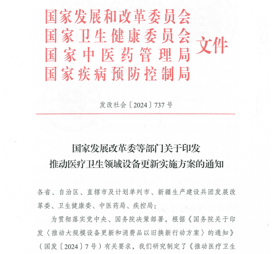 繼國務(wù)院印發(fā)《推動大規(guī)模設(shè)備更新和消費(fèi)品以舊換新行動方案》后,近日,國家發(fā)展改革委等部門印發(fā)《推動醫(yī)療衛(wèi)生領(lǐng)域設(shè)備更新實(shí)施方案》(以下簡稱《方案》),全面推進(jìn)醫(yī)療衛(wèi)生機(jī)構(gòu)裝備和信息化設(shè)施迭代升級。