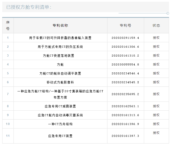 截止目前,明峰醫(yī)療方艙CT系列已獲得11項專利,還有更多專利項目正在審批過程中。