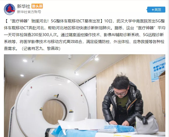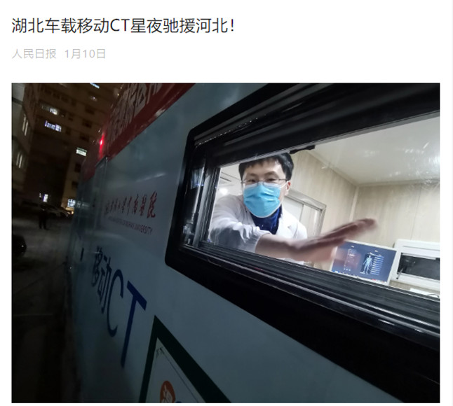 1月10日晚,央視新聞直播介紹了由武漢大學(xué)中南醫(yī)院馳援河北的明峰醫(yī)療車載CT。人民日報、新華社等媒體也做出相關(guān)報道。