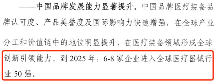 《醫(yī)療裝備產(chǎn)業(yè)發(fā)展規(guī)劃(2021-2025年)》(征求意見(jiàn)稿)在國(guó)產(chǎn)品牌發(fā)展能力方面也提出了具體目標(biāo)——到2025年,6~8家企業(yè)進(jìn)入全球醫(yī)療器械行業(yè)50強(qiáng)。