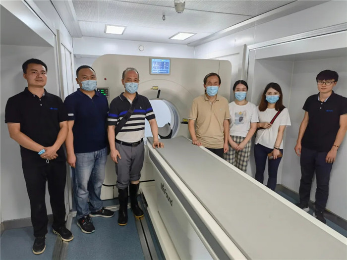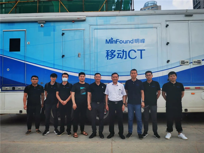 ▲鄭大一附院放射科主任張永高和劉杰技師長等人在明峰醫(yī)療移動CT內(nèi)